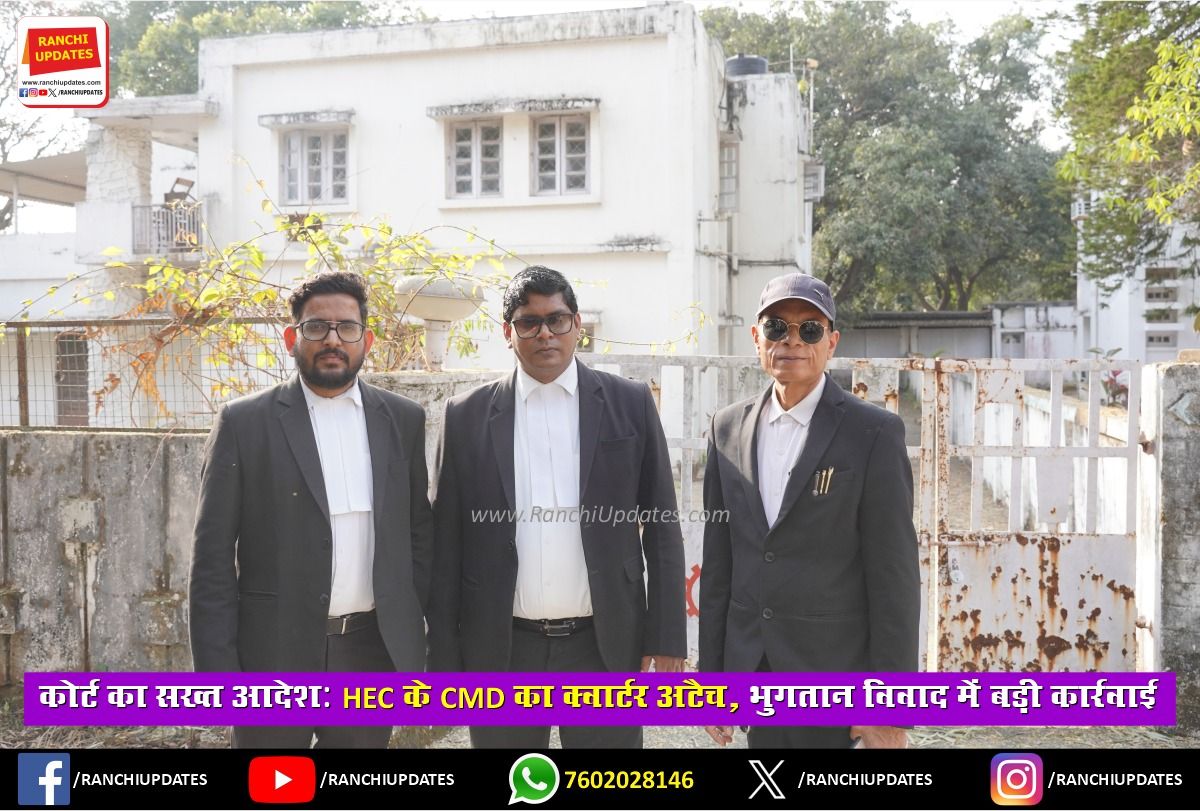 CityNews एचईसी भुगतान विवाद में कानूनी संकट, CMD का क्वार्टर अटैच... राँची स्थित एचईसी (HEC) एक बार फिर भुगतान विवाद को लेकर कानूनी संकट में घिर गई है। कोर्ट के आदेश... BY Ranchi Updates January 31, 2026 0 Comments