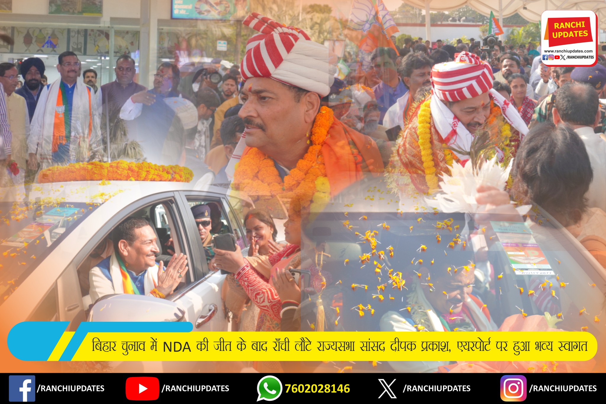 CityNews Local Alerts एनडीए की ऐतिहासिक जीत के बाद राज्यसभा सांसद दीपक प्रकाश... राज्यसभा सांसद दीपक प्रकाश आज राँची पहुंचे, जहां भाजपा कार्यकर्ताओं ने उनका एयरपोर्ट पर जोरदार स्वागत किया। दीपक प्रकाश बिहार... BY Ranchi Updates November 18, 2025 0 Comments