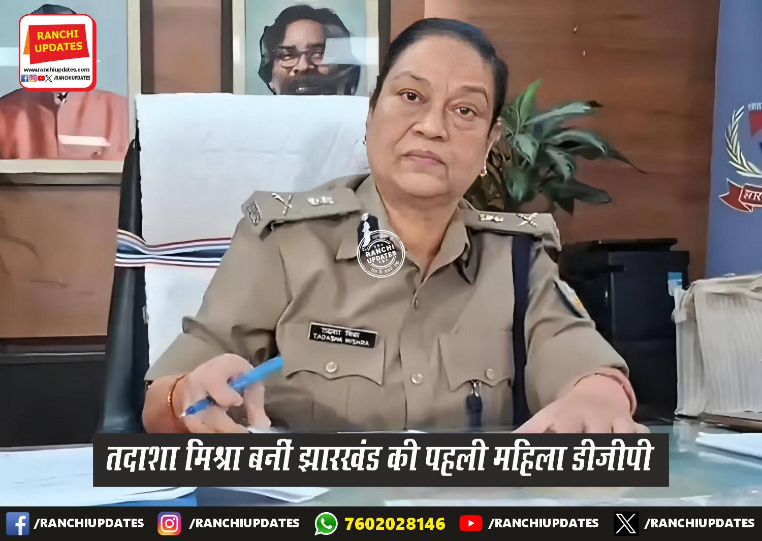 CityNews तदाशा मिश्रा बनीं झारखंड की पहली महिला डीजीपी | Tadasa... झारखंड सरकार ने 1994 बैच की वरिष्ठ आईपीएस अधिकारी तदाशा मिश्रा को राज्य का पुलिस महानिदेशक (डीजीपी) नियुक्त किया है।... BY Ranchi Updates December 30, 2025 0 Comment