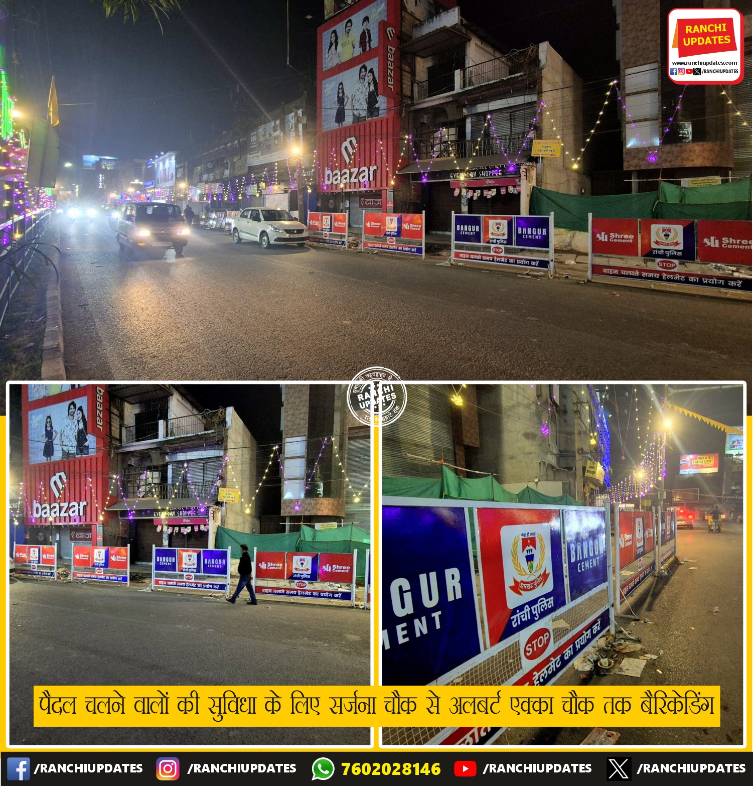 CityNews पैदल यात्रियों की सुरक्षा के लिए सर्जना चौक से अलबर्ट... पैदल चलने वालों के लिए सर्जना चौक से अलबर्ट एक्का चौक तक सड़क किनारे बैरिकेडिंग की गई है। ट्रैफिक पुलिस... BY Ranchi Updates December 18, 2025 0 Comment