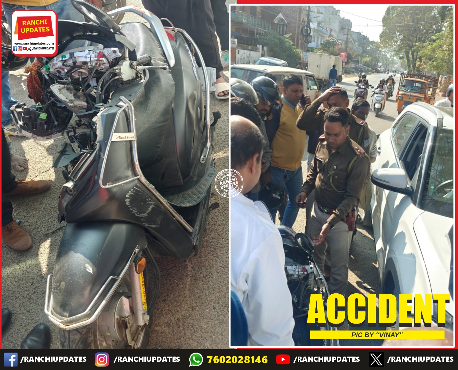 CityNews सहजानंद चौक के पास स्कूटी–क्रेटा की टक्कर, युवक घायल |... सहजानंद चौक से आगे प्रत्युष क्लासेज के पास आज एक स्कूटी और क्रेटा कार के बीच सड़क दुर्घटना हो गई।... BY Ranchi Updates December 18, 2025 0 Comment