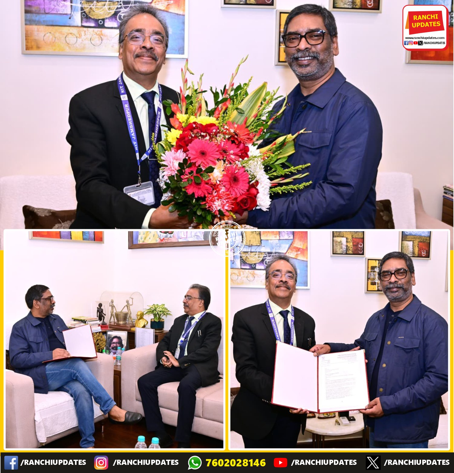 CityNews मुख्यमंत्री हेमंत सोरेन से मिले NIT जमशेदपुर निदेशक, 15वें दीक्षांत... कांके रोड स्थित मुख्यमंत्री आवासीय कार्यालय में गुरुवार को मुख्यमंत्री हेमंत सोरेन से एनआईटी जमशेदपुर के निदेशक प्रो. (डॉ.) गौतम... BY Ranchi Updates December 18, 2025 0 Comment