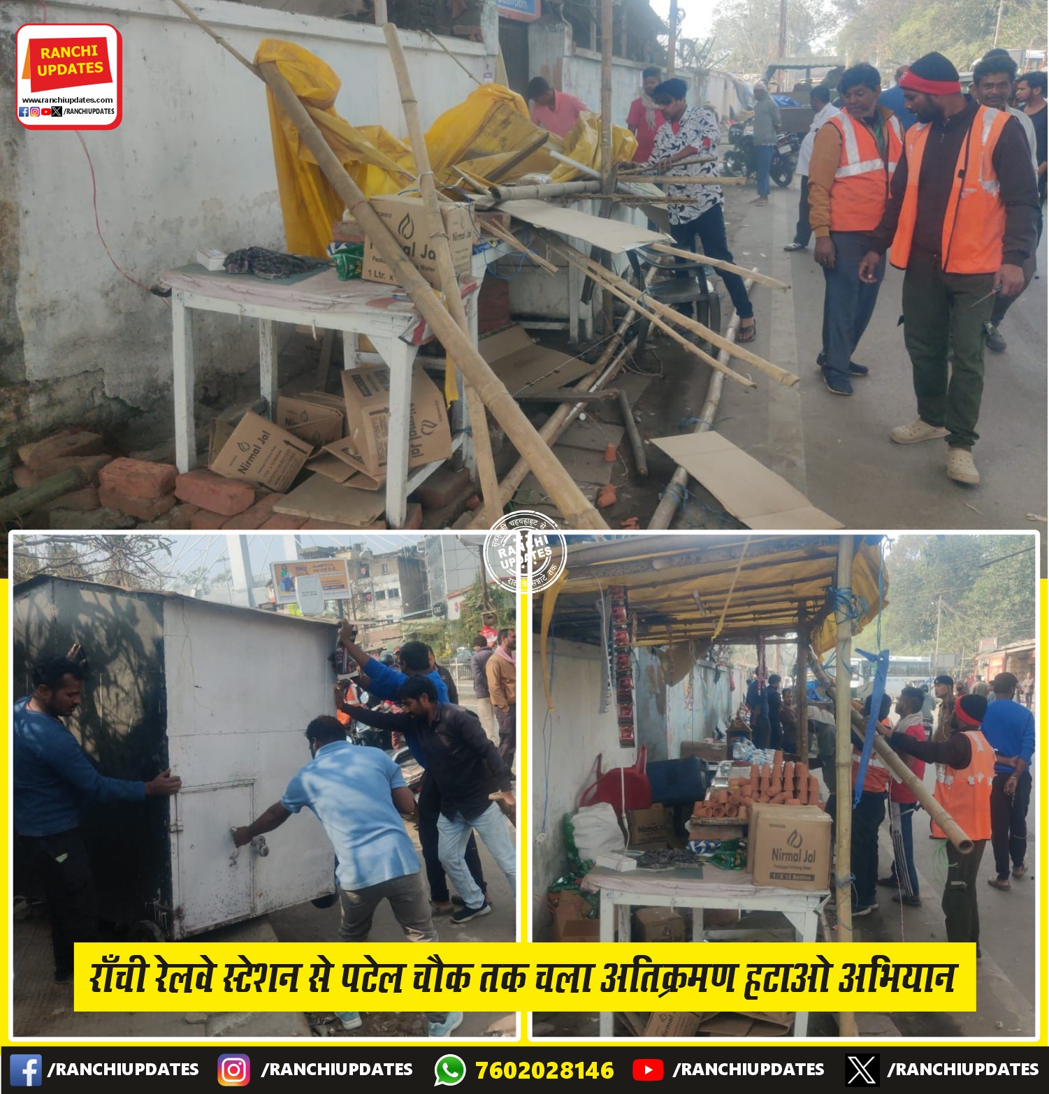 CityNews राँची रेलवे स्टेशन से पटेल चौक तक अतिक्रमण हटाओ अभियान... राँची रेलवे स्टेशन से पटेल चौक तक सड़क को अतिक्रमण एवं जाम मुक्त करने के उद्देश्य से बुधवार, 17 दिसंबर... BY Ranchi Updates December 18, 2025 0 Comment