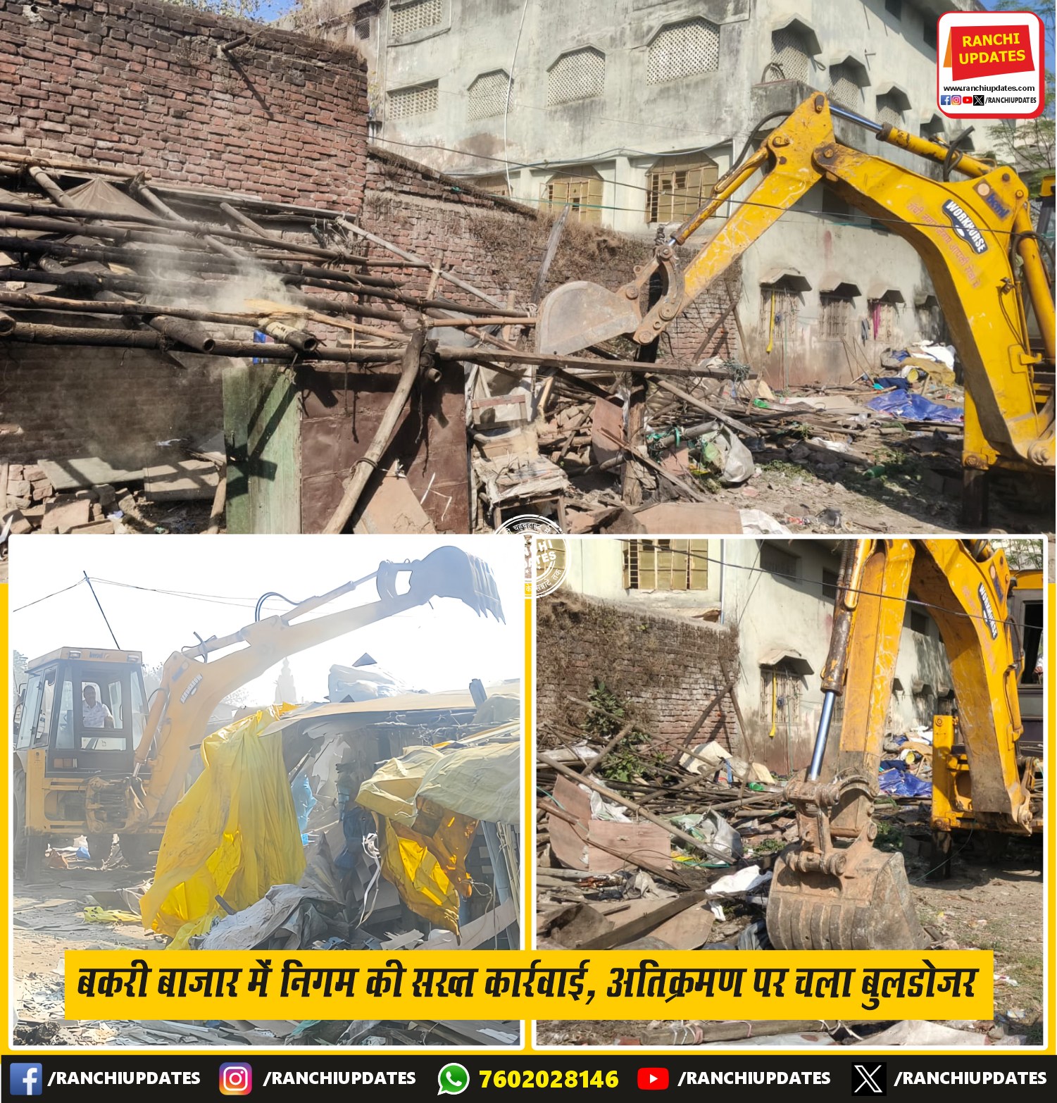 CityNews राँची नगर निगम का बड़ा अतिक्रमण हटाओ अभियान, Ranchi Municipal... राँची नगर निगम की इंफोर्समेंट टीम ने आज बकरी बाजार स्थित निगम धर्मशाला के आसपास बड़े पैमाने पर अतिक्रमण हटाने... BY Ranchi Updates December 11, 2025 0 Comment