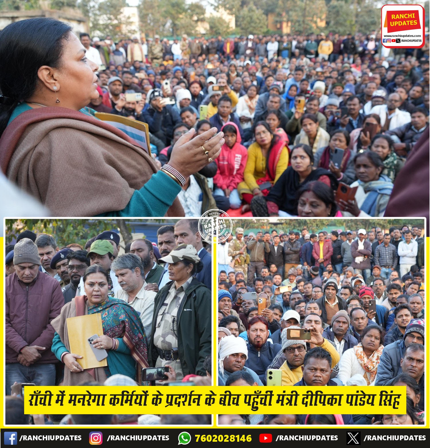 CityNews MGNREGA Workers’ Protest in Ranchi — मंत्री दीपिका पांडेय सिंह... राँची में प्रदर्शन कर रहे मनरेगा कर्मियों से ग्रामीण विकास एवं पंचायती राज विभाग की मंत्री दीपिका पांडेय सिंह ने... BY Ranchi Updates December 9, 2025 0 Comment