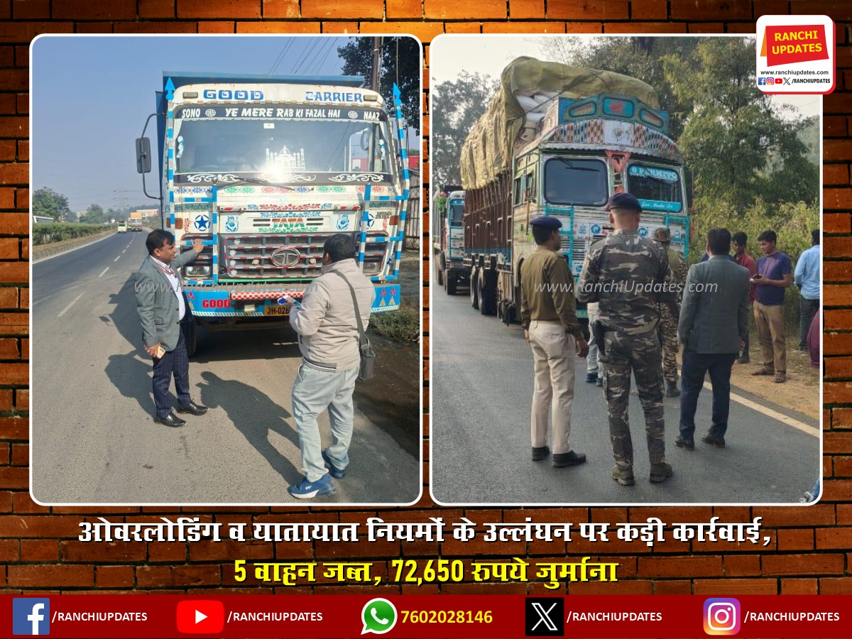 CityNews राँची में Special Vehicle Checking Drive — Heavy Vehicles पर... उपायुक्त सह जिला दण्डाधिकारी राँची श्री मंजूनाथ भजंत्री के निर्देश पर सोमवार, 8 दिसंबर 2025 को जिला परिवहन पदाधिकारी श्री... BY Ranchi Updates December 9, 2025 0 Comment