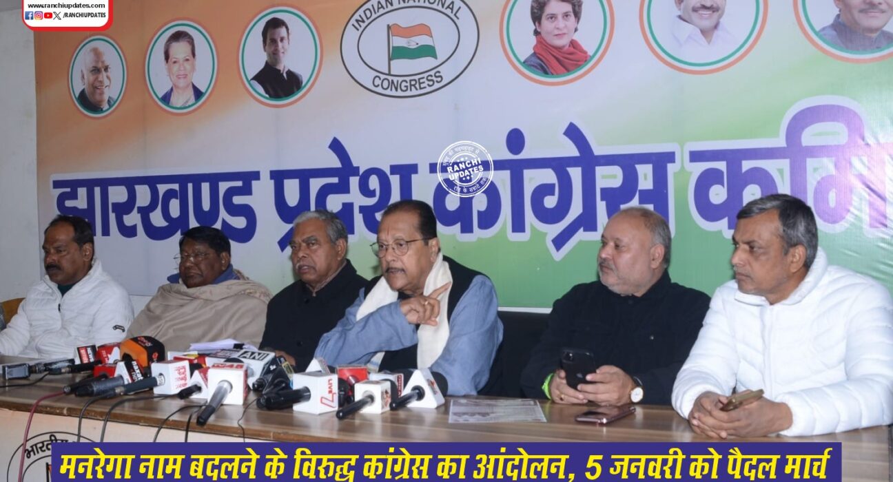 मनरेगा कानून और उसके नाम में किए गए बदलाव के विरोध में प्रदेश कांग्रेस 5 जनवरी को ‘मनरेगा बचाओ संग्राम’ का आयोजन करेगी। इस दौरान कांग्रेस कार्यकर्ता राँची के बापू वाटिका, मोरहाबादी से लोक भवन तक पैदल मार्च करेंगे। यह जानकारी शनिवार को कांग्रेस भवन में आयोजित प्रेस कॉन्फ्रेंस में प्रदेश अध्यक्ष केशव महतो कमलेश ने दी।