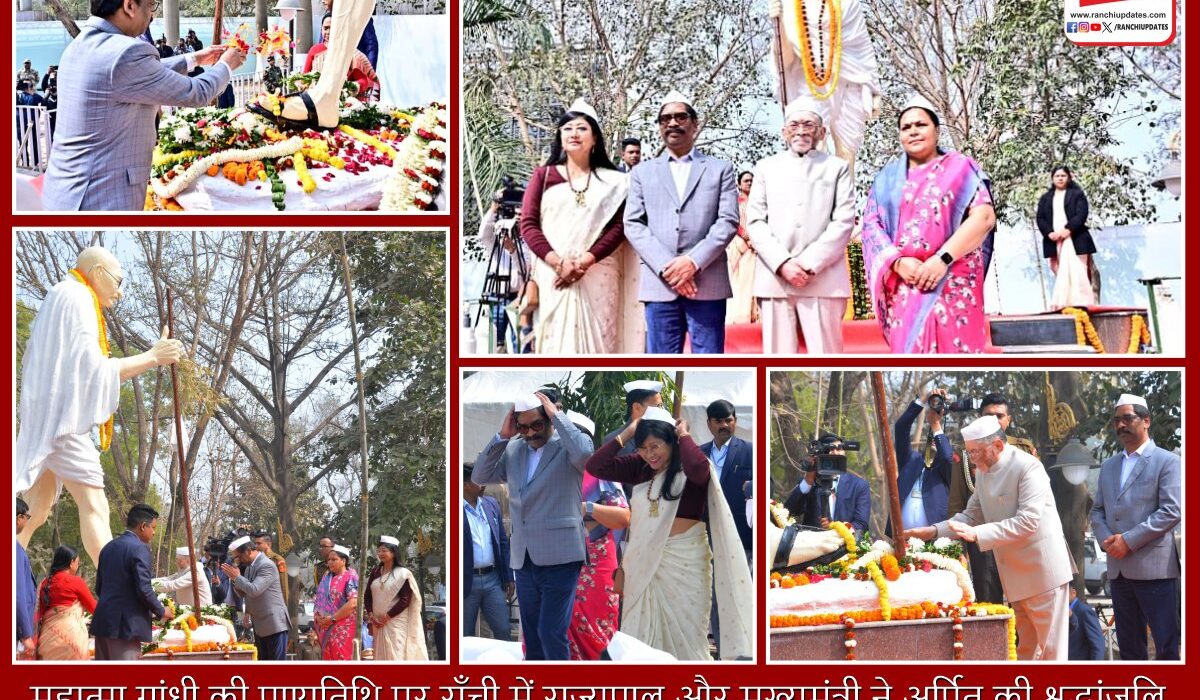 राष्ट्रपिता महात्मा गांधी की पुण्यतिथि के अवसर पर आज राँची के मोराबादी स्थित बापू वाटिका में श्रद्धांजलि कार्यक्रम का आयोजन किया गया। इस अवसर पर माननीय राज्यपाल संतोष कुमार गंगवार एवं मुख्यमंत्री हेमंत सोरेन ने बापू की प्रतिमा पर पुष्प अर्पित कर उन्हें विनम्र श्रद्धांजलि दी।