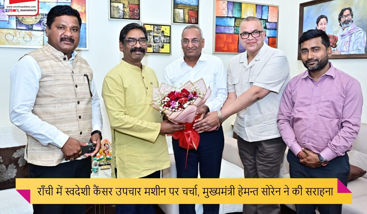 कैंसर उपचार के क्षेत्र में बड़ी पहल के तहत मुख्यमंत्री हेमन्त सोरेन से आज मुख्यमंत्री आवासीय कार्यालय, राँची में वरिष्ठ वैज्ञानिक जी.भी. के. सुब्रमण्यम ने शिष्टाचार भेंट की। इस दौरान उन्होंने अपनी स्वनिर्मित अत्याधुनिक, स्वदेशी तकनीक आधारित कैंसर उपचार मशीन की विस्तृत जानकारी दी। वैज्ञानिक ने बताया कि यह मशीन देश-विदेश के बड़े अस्पतालों में उपयोग हो रही है और कैंसर जैसी गंभीर बीमारी के इलाज में प्रभावी साबित हो रही है।