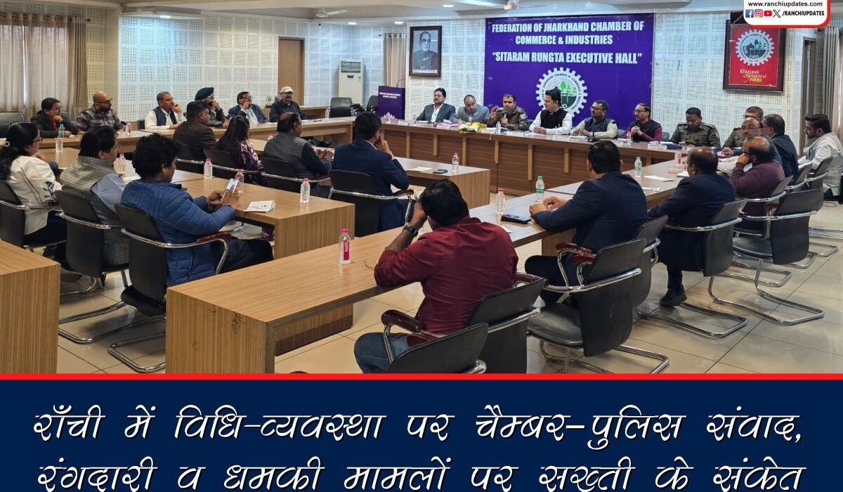 राँची में शहर की विधि-व्यवस्था को और मजबूत करने के उद्देश्य से आज चैम्बर भवन में झारखण्ड चैम्बर ऑफ कॉमर्स की अहम बैठक आयोजित की गई। बैठक में सिटी एसपी पारस राणा, सिटी डीएसपी के.वी. रमन और कोतवाली डीएसपी प्रकाश सोय ने व्यापारियों के साथ हाल के दिनों में सामने आए रंगदारी और धमकी भरे कॉल्स समेत कानून-व्यवस्था से जुड़े मुद्दों पर विस्तृत चर्चा की।