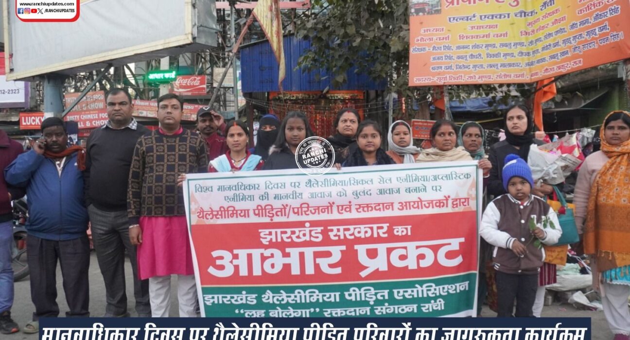 विश्व मानवाधिकार दिवस के अवसर पर राँची में थैलेसीमिया से प्रभावित बच्चों, उनके परिजनों और सामाजिक कार्यकर्ताओं ने जागरूकता कार्यक्रम का आयोजन किया। यह कार्यक्रम थैलेसीमिया पीड़ित एसोसिएशन “लहू बोलेगा” रक्तदान संगठन, राँची की ओर से अल्बर्ट एक्का चौक पर आयोजित किया गया।