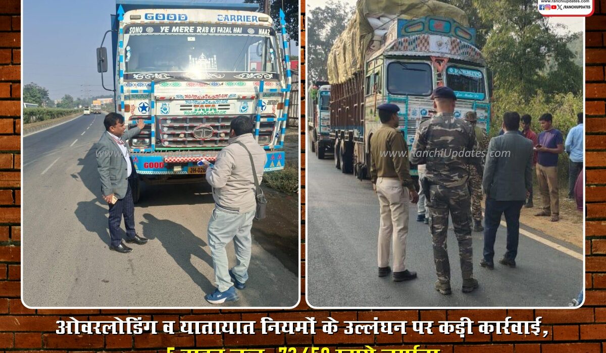उपायुक्त सह जिला दण्डाधिकारी राँची श्री मंजूनाथ भजंत्री के निर्देश पर सोमवार, 8 दिसंबर 2025 को जिला परिवहन पदाधिकारी श्री अखिलेश कुमार के नेतृत्व में राँची जिले के विभिन्न क्षेत्रों में विशेष वाहन जाँच अभियान चलाया गया। इस दौरान ट्रक, हाइवा और डंपर जैसे भारी वाहनों की सघन जाँच की गई। अभियान का मुख्य उद्देश्य सड़क सुरक्षा सुनिश्चित करना, ओवरलोडिंग पर रोक लगाना तथा मोटरयान अधिनियम का कड़ाई से पालन कराना रहा।