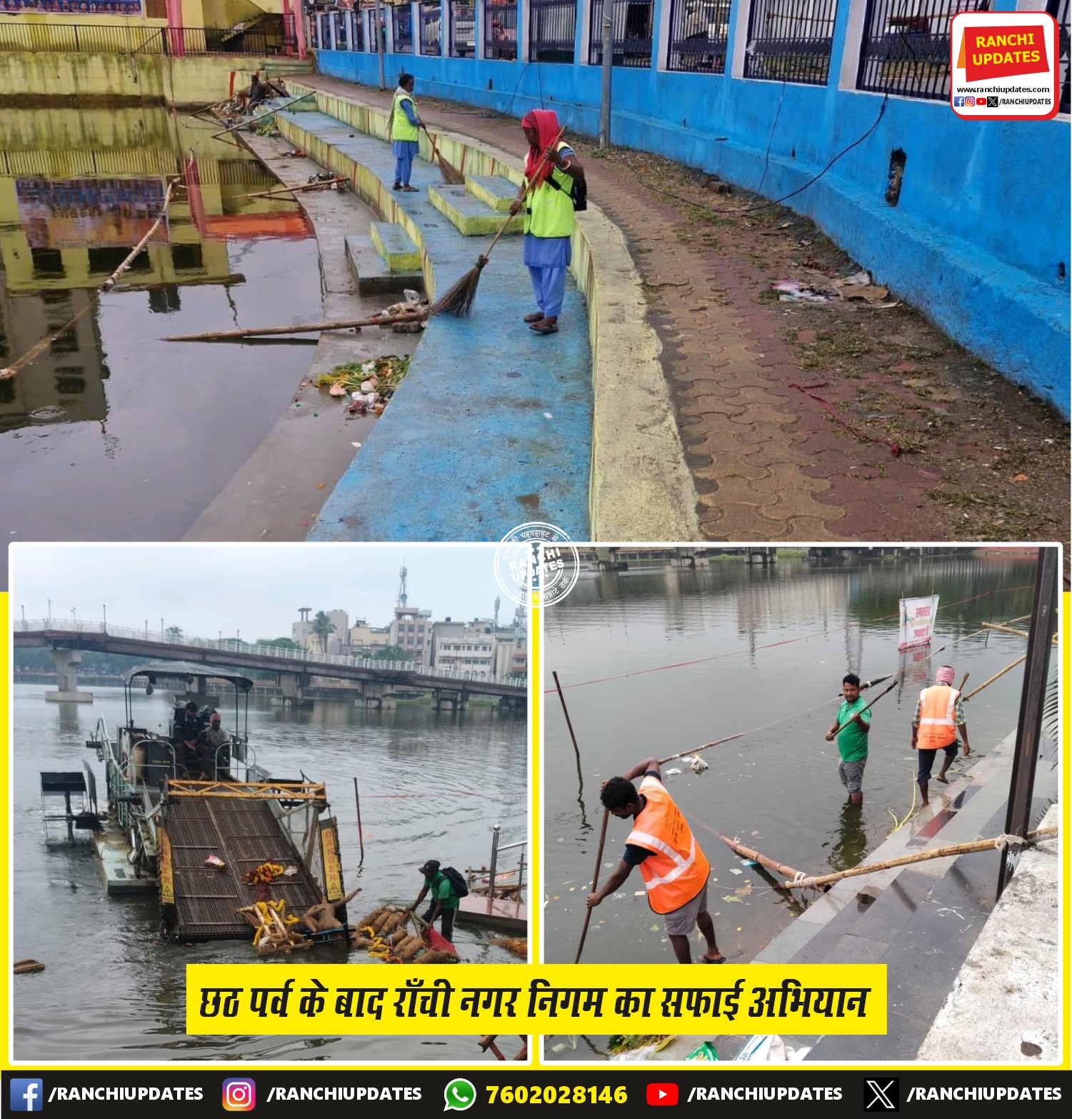 छठ महापर्व के सफल समापन के बाद राँची नगर निगम ने पूरे शहर में व्यापक सफाई अभियान चलाया। निगम की टीम ने विशेष रूप से प्रमुख जलाशयों और छठ घाटों की सफाई पर ध्यान केंद्रित किया। सफाई मित्रों ने घाटों पर पड़ी पूजा सामग्री, फूल-मालाएँ, नारियल, कपड़े और अन्य अपशिष्ट एकत्र कर उनका समुचित निस्तारण किया।