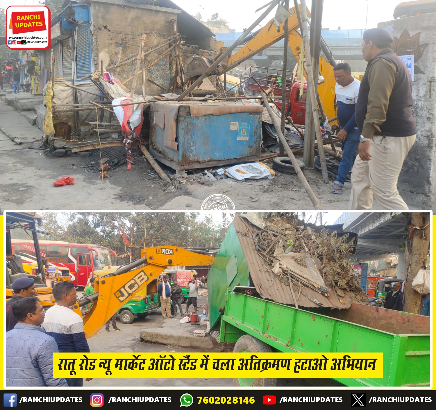 राँची नगर निगम की इनफोर्समेंट टीम ने सोमवार को रातू रोड चौक स्थित न्यू मार्केट ऑटो स्टैंड क्षेत्र में अतिक्रमण मुक्त अभियान चलाया। अभियान के दौरान परिसर में किए गए