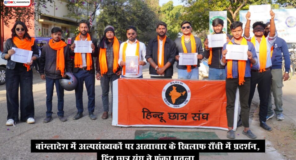 बांग्लादेश में अल्पसंख्यकों के खिलाफ बढ़ते अत्याचार को लेकर देशभर में आक्रोश है। इसी क्रम में राजधानी राँची में हिंदू छात्र संघ ने जोरदार विरोध प्रदर्शन किया। कार्यकर्ताओं ने डॉ. श्यामा प्रसाद मुखर्जी विश्वविद्यालय (DSPMU) के मुख्य द्वार पर बांग्लादेश के प्रधानमंत्री मुहम्मद यूनुस का पुतला दहन कर विरोध दर्ज कराया। प्रदर्शनकारियों ने आरोप लगाया […]
