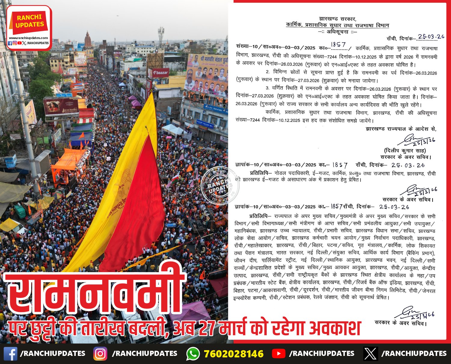 दिल्ली के लाल किला मेट्रो स्टेशन के पास हुए भीषण धमाके के बाद देशभर में सुरक्षा एजेंसियां अलर्ट मोड पर आ गई हैं। राजधानी राँची में भी पुलिस प्रशासन ने सुरक्षा व्यवस्था को कड़ा कर दिया है। शहर के प्रमुख सार्वजनिक स्थलों, बाजारों और भीड़भाड़ वाले इलाकों में पुलिस बल की तैनाती बढ़ा दी गई […]